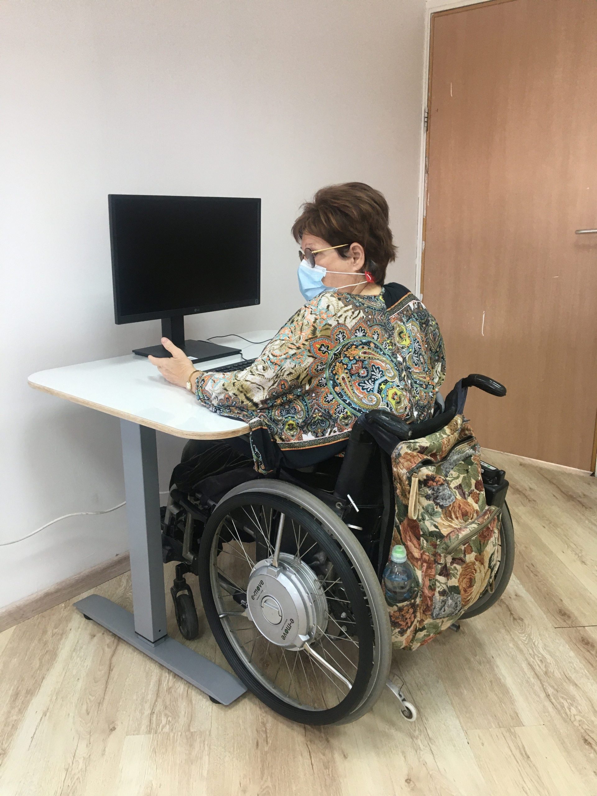 שולחן מחשב עם מנוע חשמלי. מאפשר התאמה של גובה השולחן למשתמש.